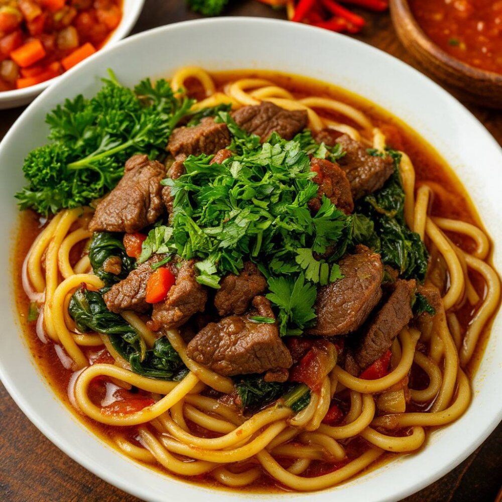 Говядина, зелень, овощи, лапша