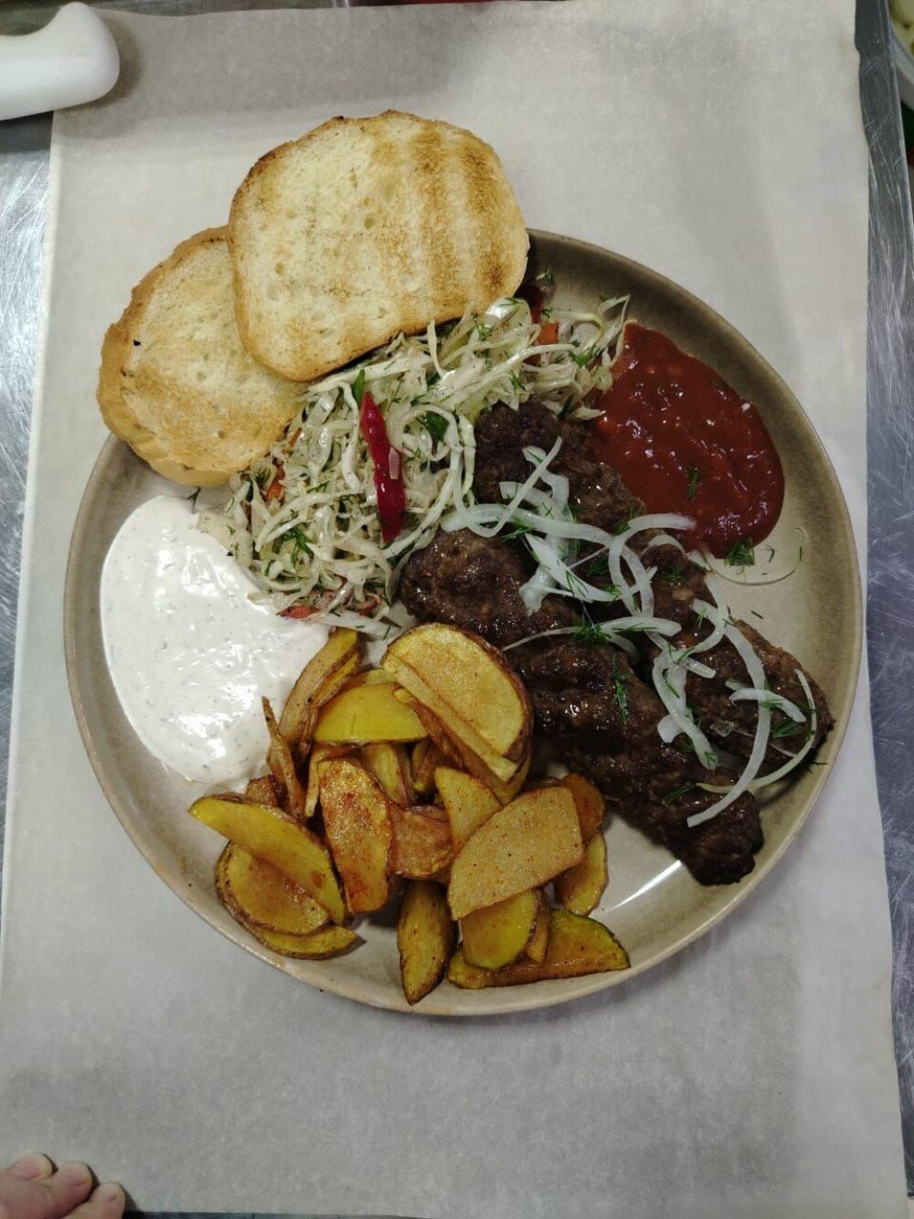 Говядина юля-кебаб, картофель в фритюре, салат из капусты, маринованный лук, соус красный, соус белый, хлеб